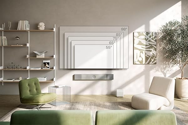 KEF XIO soundbar shown mounted on wall underneath various television sizes, Amazon